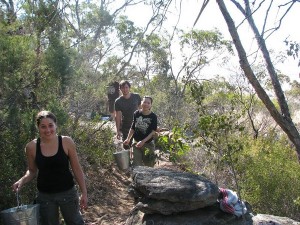 As the VCC Access and Environment Officer, many of my climbing jaunts will often include a working bee. While the Arapiles Climb and Repair Weekend has been an ongoing feature of the Victorian Climbing Clubs trip calendar for a number of years, the Queen’s Birthday weekend up at Arapiles was a particularly productive one. Working with Community Group grants from Parks Victoria and collaborating with the Friends of Arapiles, CliffCare is ensuring that the Pharos Gully Track will be able to handle the heavy traffic it receives not only from climbers, but also the walkers. On the Queens Birthday weekend we finally managed to move all the rocks from the top section down to the areas where our stonemason, Walter Braun is working on building up the track using dry stonework. No matter how many working bees I have organized, there always seems to be a huge pile of rocks that seems little diminished. Finally, it’s gone. Many of the rocks still need to be moved into place, but at least the transportation has been done. Now for the lower section….