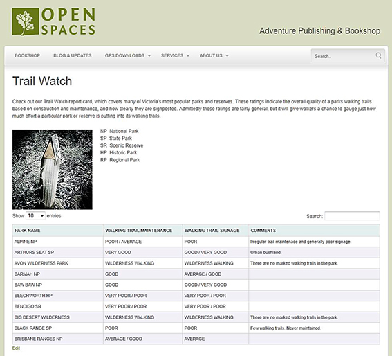 Check out our Trail Watch report card, which covers many of Victoria’s most popular parks and reserves. These ratings indicate the overall quality of a parks walking trails based on construction and maintenance, and how clearly they are signposted. Admittedly these ratings are fairly general, but it will give walkers a chance to gauge just how much effort a particular park or reserve is putting into its walking trails.