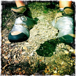 Our first real issue was Michelle’s walking boots. Apparently she had not used them for some time and immediately after pulling them on the rubber soles decided to part company with the uppers. Greg’s skills with a roll of gaffa tape and five minutes later the problem was (at least temporarily) solved.