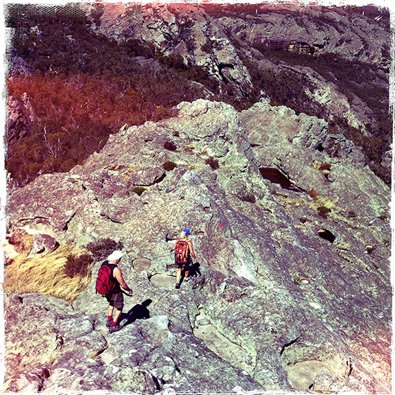 After an hour or so I reached a major trail junction. Here I met a group of walkers who had come up from Mt Zero Picnic Area and were sitting on the rocks trying to figure out which way to go. All of the trail signs were laying in the trees, having been pulled from the ground. Why anyone would want to do this is beyond me. I pointed them in the right direction and they happily set off towards Stapylton Campground. I on the other hand continued on up towards the top of Mt Stapylton. The trail weaved its way up the northern side of the rocks before sidling up to a rocky ridge. Here a metal sign indicated that walkers should only proceed in good weather. No problem today.