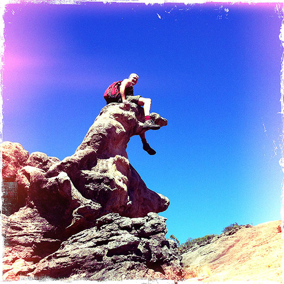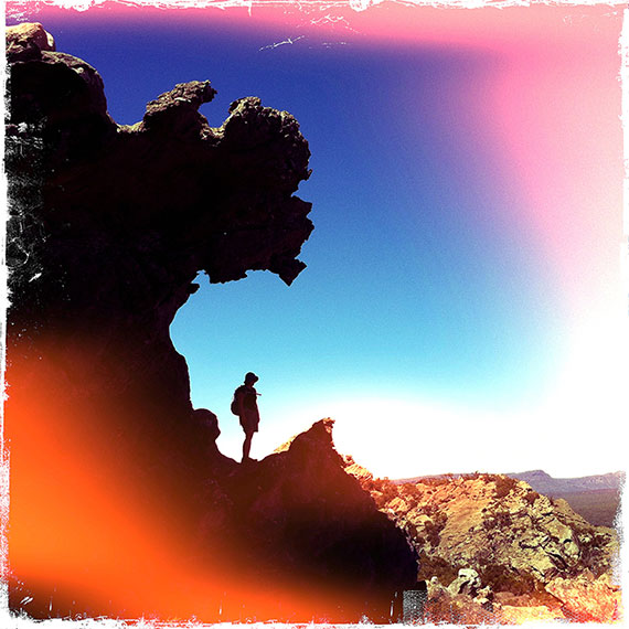 After an hour dozing in the sun I reluctantly left the summit and started down. Back at the junction I continued along the trail towards Mt Zero Picnic Area. The walk descends long rocky ramps past Bird Rock and underneath Taipan Wall, a soaring bastion of overhanging red rock, before meandering through the Mt Stapylton Amphitheatre. At the Mt Zero Picnic Area turnoff I pushed on a little further to the top of Flat Rock. This short diversion allowed me to look back into the amphitheatre and view the half-moon escarpment as it started to reflect the late afternoon sun. The final 4.4km of sandy trail led me down from the amphitheatre and back along the range underneath the Mount of Olives to where I rejoined my footsteps from earlier in the day at Pohlner Road. By the time I arrived back at Stapylton Campground the sun was low in the western sky and I was low on energy. Definitely time to warm up in front of the camp-fire and refuel.