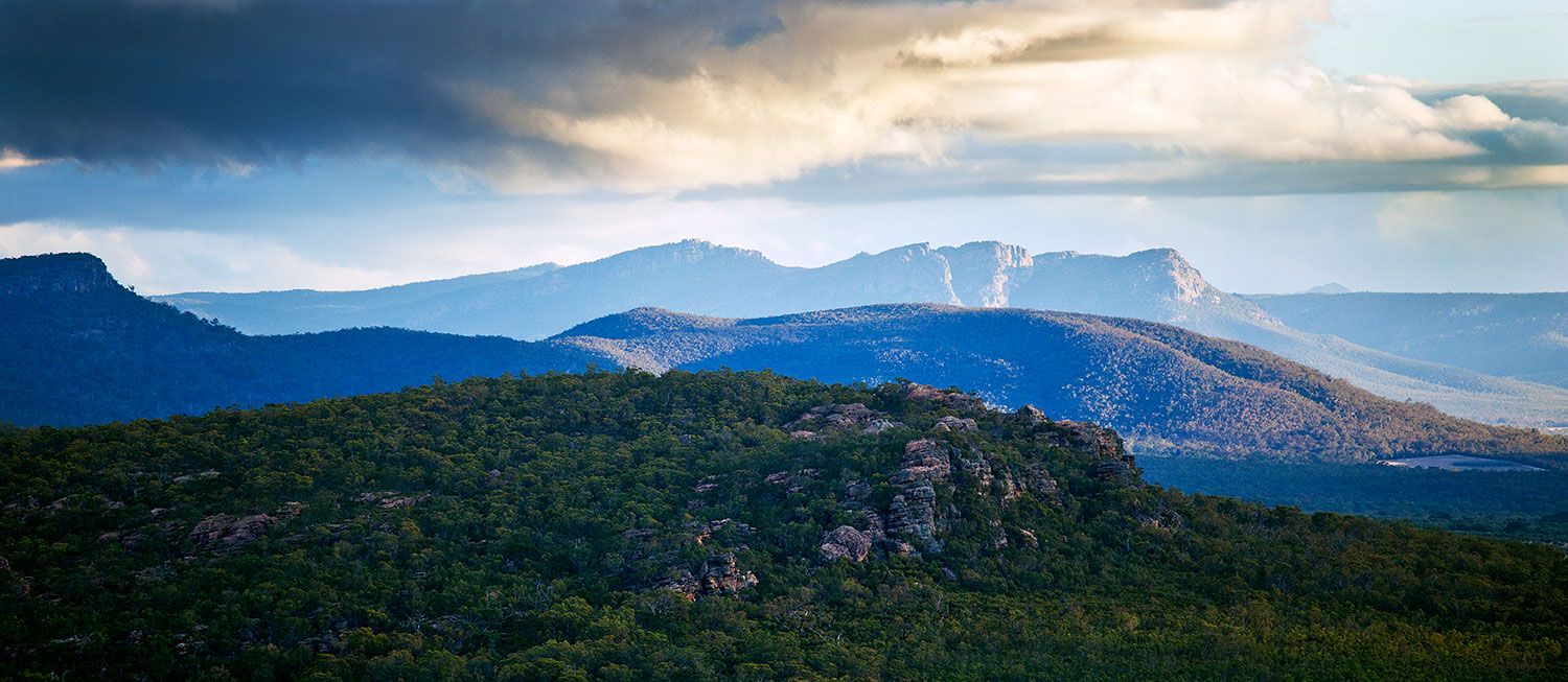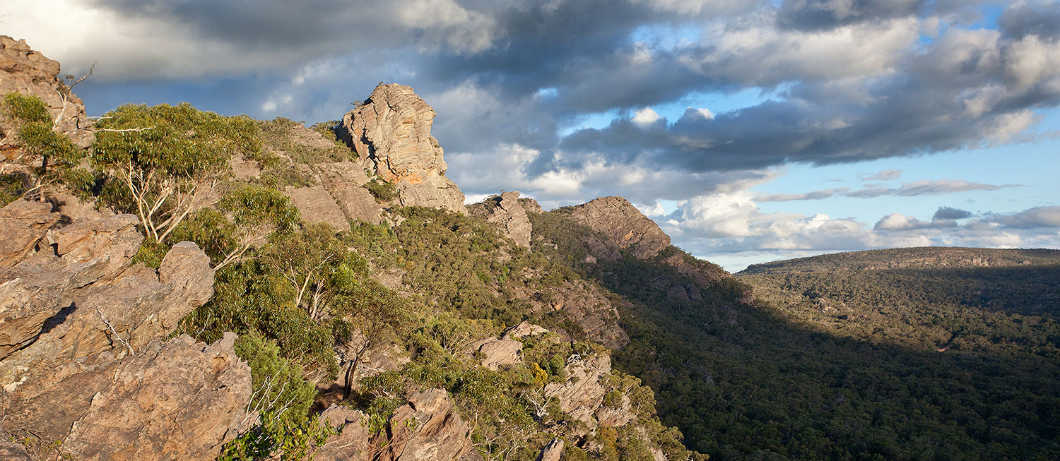 Mt Stapylton is only 518m above-sea-level but its isolated rocky mass and commanding position makes it one of my favourite viewpoints in the Grampians. Off the the northwest I could see Mt Arapiles and its distinctive tiny neighbour, Mitre Peak, rising above a sea of wheat stubble. As I turned counter-clockwise I could make out the bluffs of the Black Range and, almost abutting it, the entire backbone of the Grampians National Park as it stretched, broken and twisted, south towards the coast.