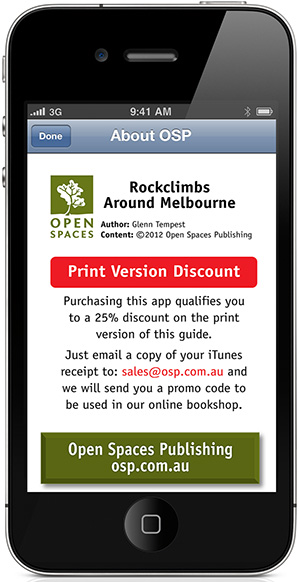 iCrag – Melbourne sells for $14.99. Those purchasing the app will be entitled to a 25% discount (rom Open Spaces) on the print version of Rockclimbs Around Melbourne. You can find the details about this great deal by clicking on the About OSP button on the home screen of the app.