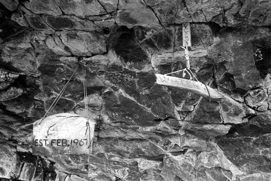 The original wooden plaques inside the cave, apparently carved by climbing legend Roland Pauligk (inventor of the RP) in February 1967.