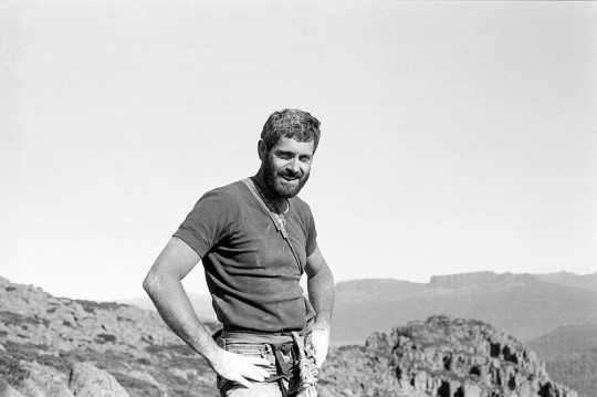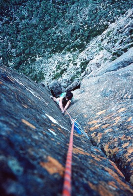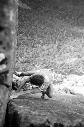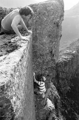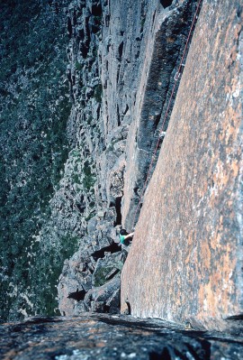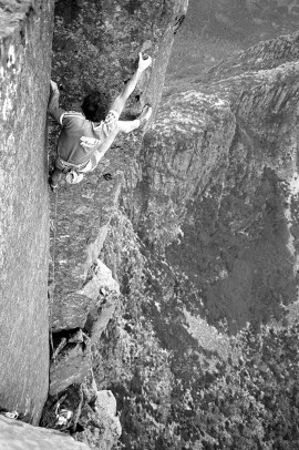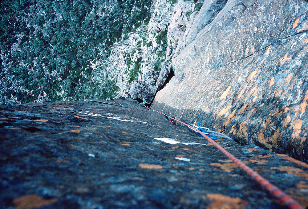 We did a handful of new routes on the Acropolis North Face, the best of which were two single-pitch climbs called Astro Boy (24) and Black Man’s Country (25). The top photo, taken by Chris Baxter, shows me approaching the final hard moves on Black Man’s Country (25) during the first ascent. Dave Moss looks on. It probably wouldn’t rate as grade 25 these days but Russ and I both agreed at the time that it would have been graded 5.12a in Yosemite Valley. These days small cams and improved shoe design really helps on these thin sustained crack problems.