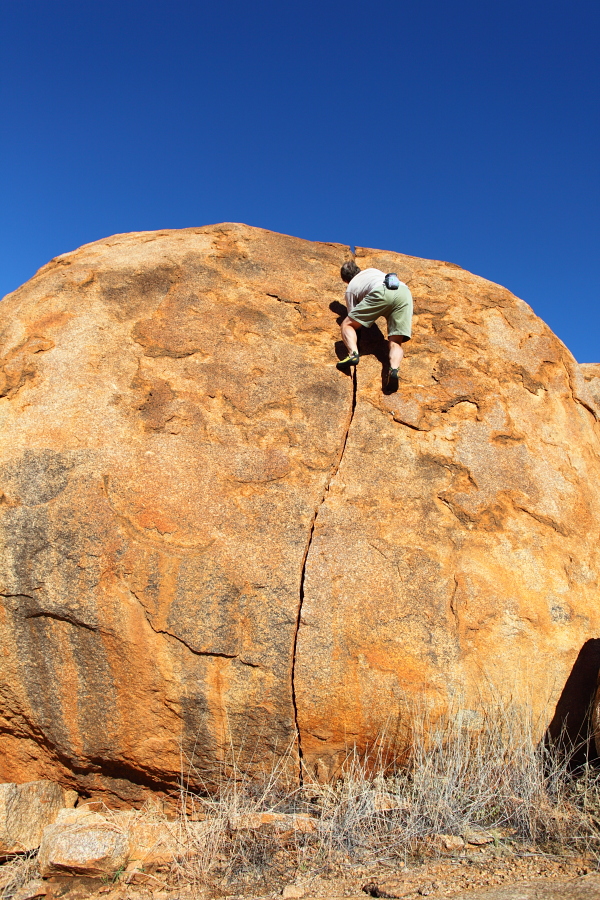 Last Wednesday, on our long drive up to Darwin, Karen and I dropped in to the Karlu Karlu (Devils Marbles) Conservation Reserve. It was much more interesting than I expected so we decided to spend the rest of the day (and the following morning) exploring and bouldering in this remarkable area. First impressions upon driving into the reserve was that it looked like a geologically interesting place but the rock appeared to be crap for climbing. Rounded granite boulders shedding exfoliation flakes like onion skins didn’t give me much confidence that we would find any worthwhile bouldering. Surprisingly I was wrong. The rock is pretty coarse (a bit coarser than Mt Buffalo) but is remarkably solid. Even the flakes were much more solid than they looked. In the end I did a bunch of really enjoyable problems, none of them were particularly difficult but all were full value (and often pretty high!). There are literally hundreds of boulders in the area. Face climbing on flake edges is pretty much what is on the menu but there are also a few excellent cracks and aretes to play on. There are a few fun short climbs as well (15m-high) but nothing to get too excited over. There is a good campground in the reserve (situated right in the middle of the boulders). A small fee is charged ($3.30 per person) but you will need to get in early as it packs out with grey nomads and their caravans. The Devils Marbles are on the Stuart Highway, 105km south of Tennant Creek.