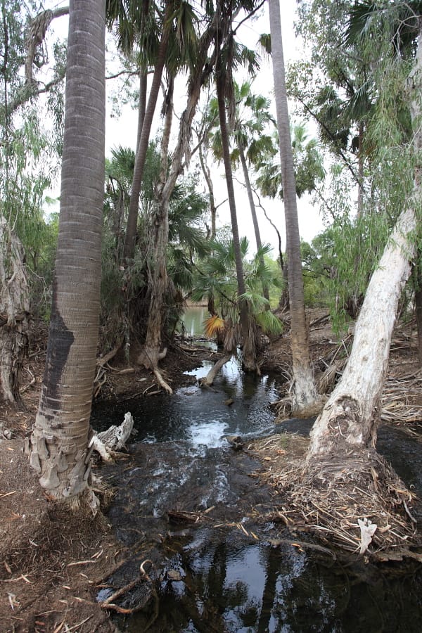 After leaving Devils Marbles, driving north, we spent two nights at Elsey National Park, on the outskirts of Mataranka. This 14,000ha park features the Roper River as well as the famous Mataranka Thermal Pool and Bitter Springs. This park also marks the start of the tropical rainforests, a big change after the long drive through the semi-arid interior. The springs were just amazing, especially Bitter Springs which retains more of its natural surroundings and is less crowded. We also did the 8km return walk along the Roper River to Matarnaka Falls. We were mainly croc spotting which was fortunate as the ‘falls’ were seemingly missing having been replaced with a piddly half metre cascade! Elsey National Park is situated an hours drive south of Katherine.