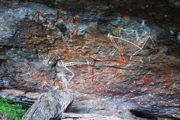 Still in Kakadu National Park, Karen and I spent yesterday on the 12km-long (actually it is about 10.5km) Barrk Walk which starts at the popular Anbangbang Art Site at Nourlangie. The paintings are pretty amazing and are well worth checking out. What we weren’t prepared for however was all the various paintings that could be found along the walk. Interestingly these art sites are not advertised as part of the walks attraction. The Barrk Walk climbs to the top of the escarpment past a small seasonal waterfall and then traverses across the escarpment tops, weaving among hundreds of weathered rock formations. Its a walk full of surprises and the views of the Kakadu wetlands seemingly stretch forever. About halfway along the walk, at the base of the escarpment, we reached Nanguluwur, another wonderful art site. This one is a little off the beaten path for most tourists and is a tranquil place. All in all an excellent walk.