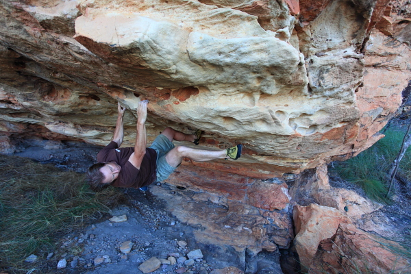 Called into Keep River National Park today. This small park is in the Northern Territory and lies against the Western Australian border. Keep River National Park is geographically the start of the Kimberley which stretches off to the west. The spectacular rock formations in this park are made up of a fairly weird sandstone quartzite pebble-dash mix which means that longer multi-pitch routes are pretty unappealing. There are some good sections of shorter overhanging stuff which provides for a bit of good bouldering if you are in the area. All the problems I did were just a few minutes walk from the scenic Gurrandalng camping area. There are also some short red walls (under 20m-high) that would offer some good climbing if you can be bothered.