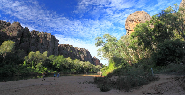 Last week Karen and I dropped into Windjana Gorge National Park. We put up our tent in the nearby campground and then set off on a 9km return walk through the gorge. I’ve got to say, I wasn’t prepared for what we found. The gorge is carved through a 100m-high limestone ridge which forms the bulk of the Napier Range. A sandy path hugs the banks of the Lennard River, which at this time of year is fairly slow moving and not very deep. Freshwater crocodiles can be seen all along the riverbank and in places were only a few metres from us. Pretty cool creatures. What really struck me about the walk was how spectacular it is. The limestone walls tower above the walkers and the place is alive with birds and animals.