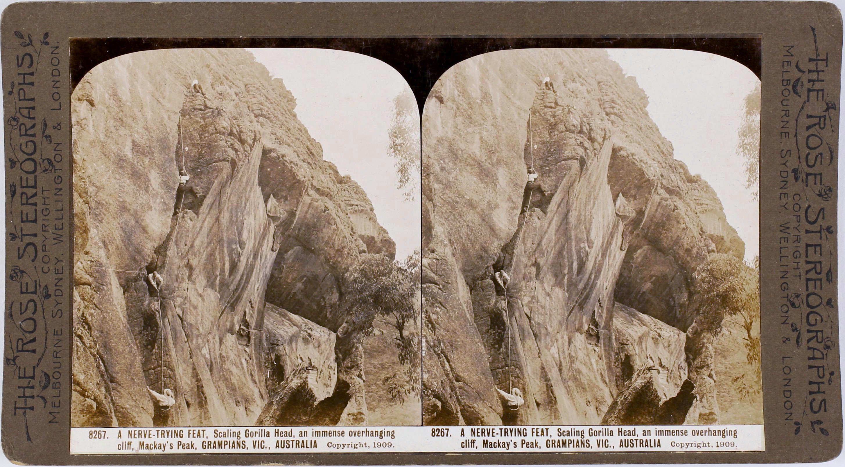 So there you have it. The cliff is Mackeys Peak (once called Cherub Peak), a large cliff overlooking Halls Gap in the central Grampians. The climb is called Manolete, three pitches at grade 11 and which had its first recorded ascent by Phillip Stranger in 1967. In future I propose that Manolete be returned back to its original name of Gorilla Head (the reason why is obvious) and the first ascent should be recorded as 1909. It’s a shame we don’t have the name of the first ascentionists. There has to be records somewhere of who these people were and maybe one day we will find them. This image and a number of other stereographs (by George Rose and others) are providing proof that the Grampians have played a significant role in Australia’s rich rock climbing history for at least 110 years. In other words, rock climbing should be viewed along with bushwalking as the first recreational pursuits to be enjoyed in the Grampians. Hopefully Parks Victoria takes this into consideration in the coming months and years ahead.