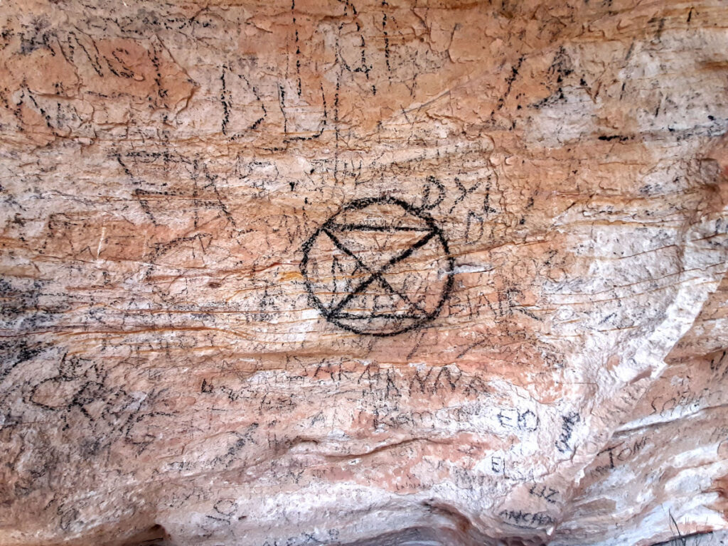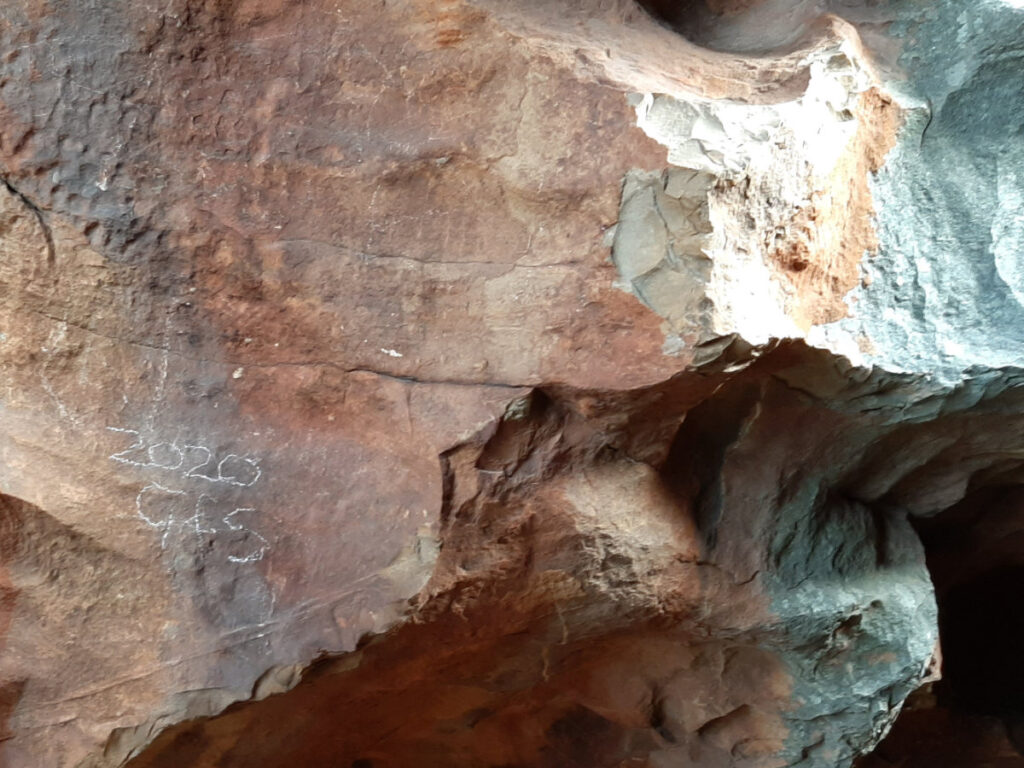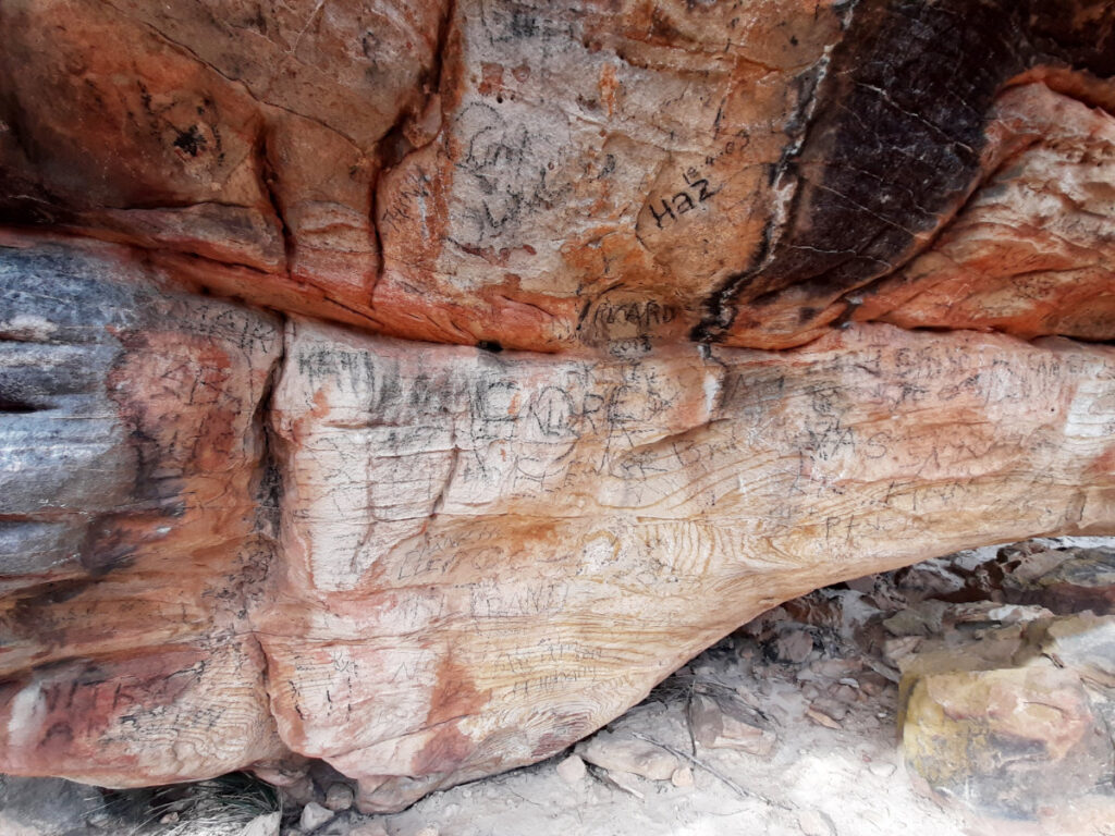Similar damage at the caves north of the Burrunj north site. It amazes me that someone would scrawl their name and then do so again a few years later in 2019. Robbie Mitchell. Fool.